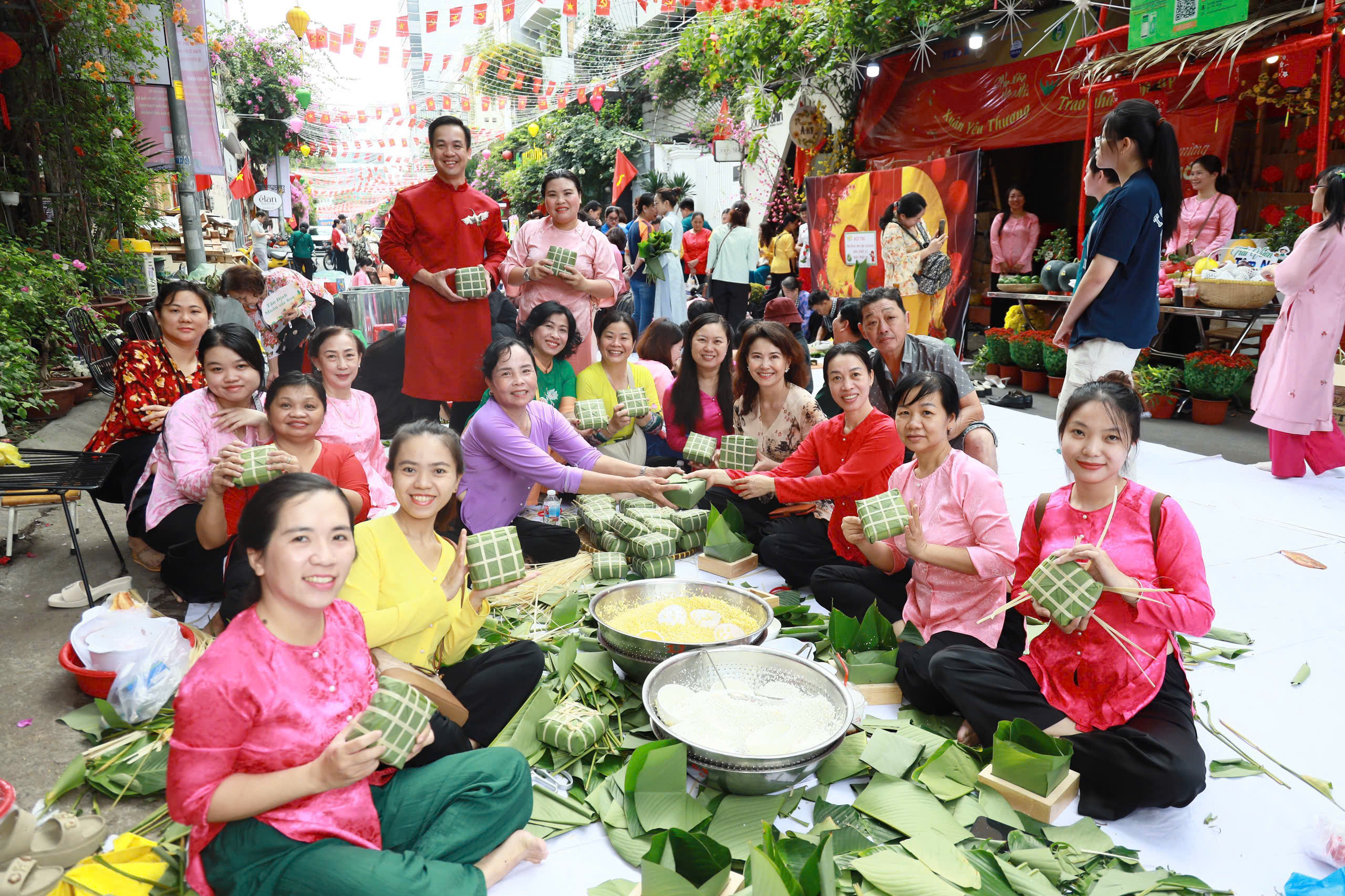 Hoạt động gói bánh chưng tập thể là điểm nhấn nổi bật của ngày hội năm nay. Từ sáng sớm, khuôn viên phường Tân Định đã rộn ràng tiếng cười, tiếng trò chuyện khi các cô chú, đoàn viên, doanh nghiệp và người dân cùng nhau rửa lá dong, vo nếp, xếp đậu, gói bánh.